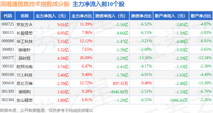 资金流向方面,深港通信息技术(983027)指数成份股当日主力资金净流入合计10.03亿元,游资资金净流出合计21.98亿元,散户资金净流入合计11.95亿元。成份股资金流向详情见下表: