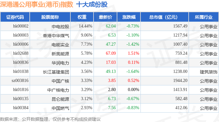 深港通公用事业(港币)(983032)指数十大成份股详情如下: