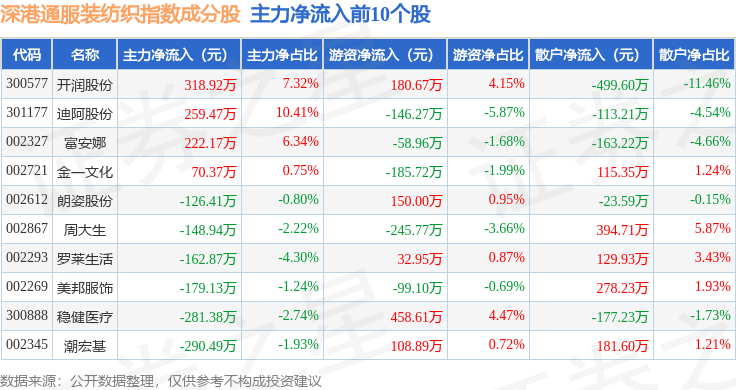 资金流向方面,深港通服装纺织(983041)指数成份股当日主力资金净流出合计1.29亿元,游资资金净流出合计5891.0万元,散户资金净流入合计1.88亿元。成份股资金流向详情见下表: