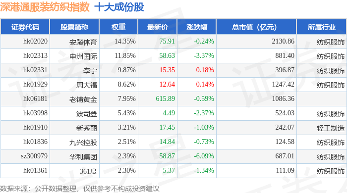 深港通服装纺织(983041)指数十大成份股详情如下: