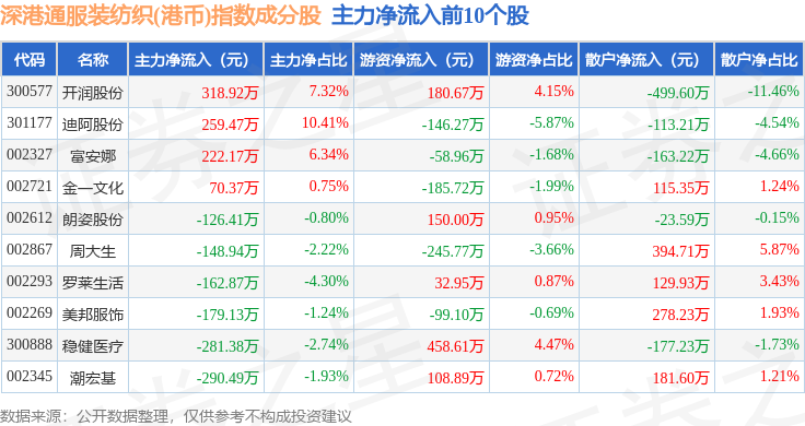 资金流向方面,深港通服装纺织(港币)(983042)指数成份股当日主力资金净流出合计1.29亿元,游资资金净流出合计5891.0万元,散户资金净流入合计1.88亿元。成份股资金流向详情见下表: