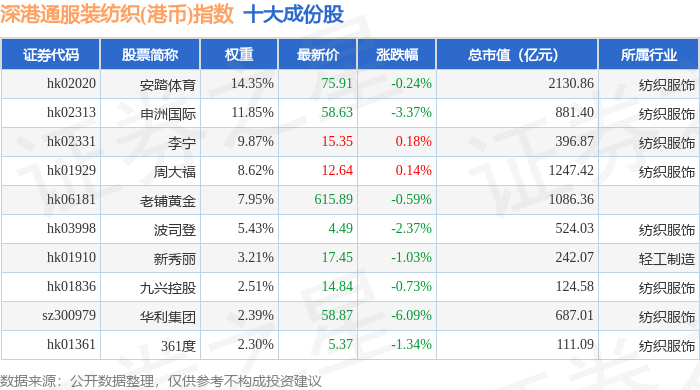 深港通服装纺织(港币)(983042)指数十大成份股详情如下: