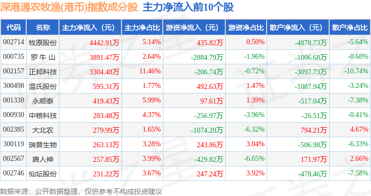 资金流向方面,深港通农牧渔(港币)(983052)指数成份股当日主力资金净流入合计2175.64万元,游资资金净流出合计612.72万元,散户资金净流出合计1562.92万元。成份股资金流向详情见下表: