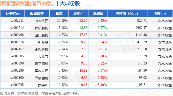 深港通农牧渔(港币)(983052)指数十大成份股详情如下: