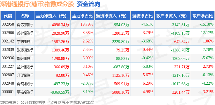 资金流向方面,深港通银行(港币)(983082)指数成份股当日主力资金净流入合计2704.11万元,游资资金净流入合计5122.27万元,散户资金净流出合计7826.37万元。成份股资金流向详情见下表: