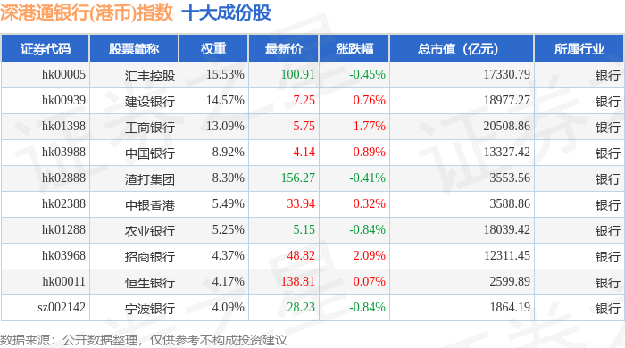 深港通银行(港币)(983082)指数十大成份股详情如下: