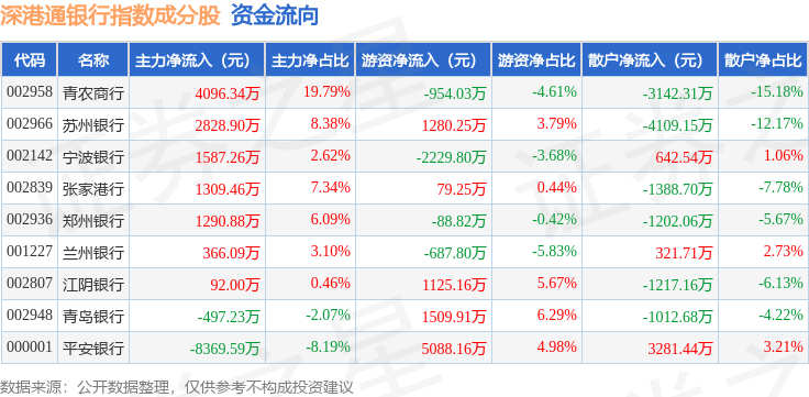 资金流向方面,深港通银行(983081)指数成份股当日主力资金净流入合计2704.11万元,游资资金净流入合计5122.27万元,散户资金净流出合计7826.37万元。成份股资金流向详情见下表: