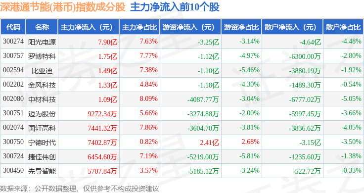 资金流向方面,深港通节能(港币)(983086)指数成份股当日主力资金净流入合计11.22亿元,游资资金净流出合计9.13亿元,散户资金净流出合计2.09亿元。成份股资金流向详情见下表: