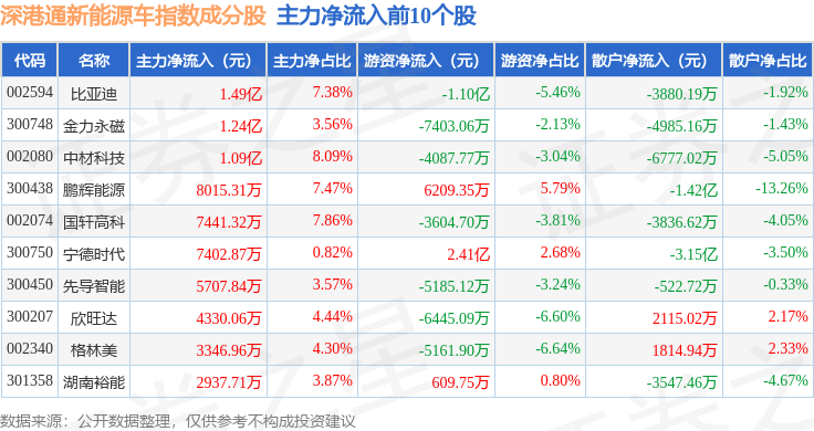 资金流向方面,深港通新能源车(983087)指数成份股当日主力资金净流出合计15.75亿元,游资资金净流入合计1.53亿元,散户资金净流入合计14.23亿元。成份股资金流向详情见下表: