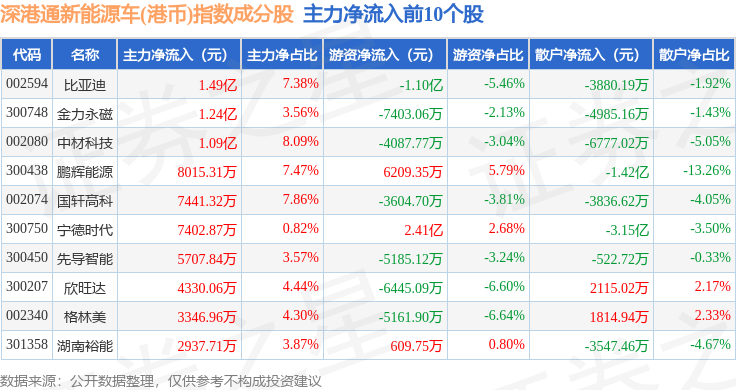 资金流向方面,深港通新能源车(港币)(983088)指数成份股当日主力资金净流出合计15.75亿元,游资资金净流入合计1.53亿元,散户资金净流入合计14.23亿元。成份股资金流向详情见下表: