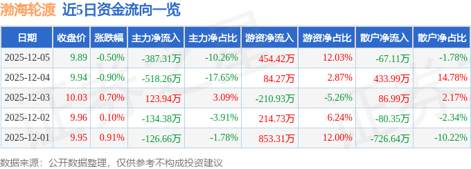 证券之星消息,截至2025年12月5日收盘,渤海轮渡(603167)报收于9.89元,下跌0.5%,换手率0.81%,成交量3.82万手,成交额3776.64万元。