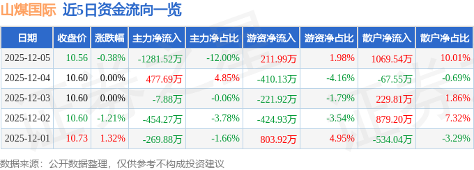 证券之星消息,截至2025年12月5日收盘,山煤国际(600546)报收于10.56元,下跌0.38%,换手率0.51%,成交量10.13万手,成交额1.07亿元。