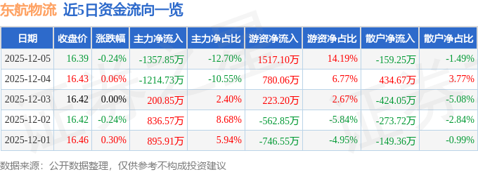 证券之星消息,截至2025年12月5日收盘,东航物流(601156)报收于16.39元,下跌0.24%,换手率0.69%,成交量6.55万手,成交额1.07亿元。
