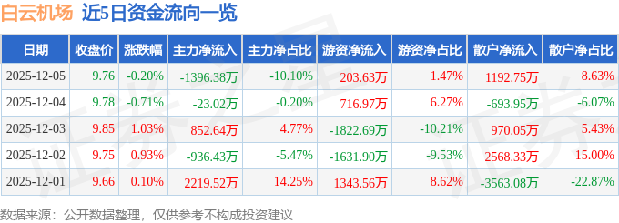证券之星消息,截至2025年12月5日收盘,白云机场(600004)报收于9.76元,下跌0.2%,换手率0.6%,成交量14.2万手,成交额1.38亿元。