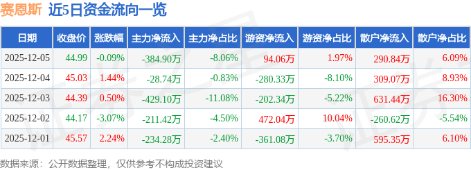 证券之星消息,截至2025年12月5日收盘,赛恩斯(688480)报收于44.99元,下跌0.09%,换手率1.12%,成交量1.06万手,成交额4775.16万元。