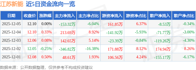 12月5日的资金流向数据方面,主力资金净流出153.32万元,占总成交额6.04%,游资资金净流入161.85万元,占总成交额6.37%,散户资金净流出8.53万元,占总成交额0.34%。