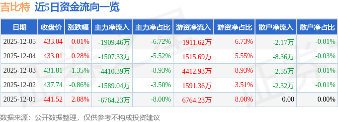 证券之星消息,截至2025年12月5日收盘,吉比特(603444)报收于433.04元,上涨0.01%,换手率0.91%,成交量6586.0手,成交额2.84亿元。