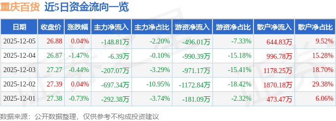 证券之星消息,截至2025年12月5日收盘,重庆百货(600729)报收于26.88元,上涨0.04%,换手率1.32%,成交量2.53万手,成交额6769.98万元。
