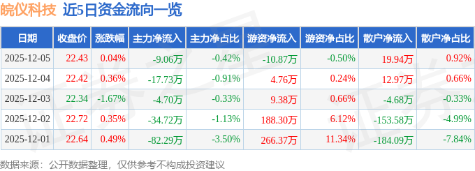 证券之星消息,截至2025年12月5日收盘,皖仪科技(688600)报收于22.43元,上涨0.04%,换手率0.72%,成交量9720.0手,成交额2168.38万元。