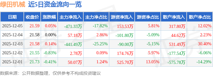 证券之星消息,截至2025年12月5日收盘,绿田机械(605259)报收于21.59元,上涨0.05%,换手率0.71%,成交量1.23万手,成交额2644.74万元。