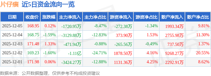 证券之星消息,截至2025年12月5日收盘,片仔癀(600436)报收于168.95元,上涨0.12%,换手率0.2%,成交量1.21万手,成交额2.03亿元。