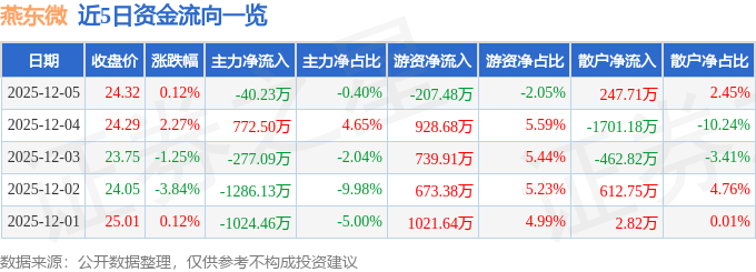 证券之星消息,截至2025年12月5日收盘,燕东微(688172)报收于24.32元,上涨0.12%,换手率0.72%,成交量4.2万手,成交额1.01亿元。