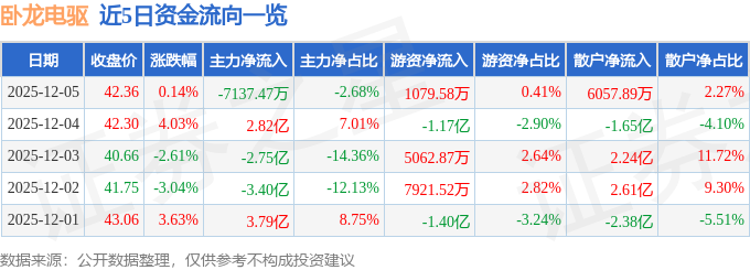 证券之星消息,截至2025年12月5日收盘,卧龙电驱(600580)报收于42.36元,上涨0.14%,换手率4.05%,成交量63.31万手,成交额26.65亿元。