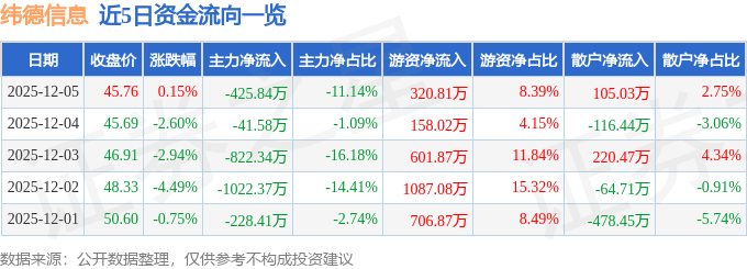 12月5日的资金流向数据方面,主力资金净流出425.84万元,占总成交额11.14%,游资资金净流入320.81万元,占总成交额8.39%,散户资金净流入105.03万元,占总成交额2.75%。