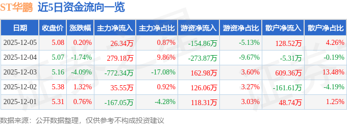 证券之星消息,截至2025年12月5日收盘,ST华鹏(603021)报收于5.08元,上涨0.2%,换手率1.89%,成交量6.05万手,成交额3019.05万元。