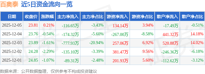 证券之星消息,截至2025年12月5日收盘,百奥泰(688177)报收于23.81元,上涨0.21%,换手率0.35%,成交量1.44万手,成交额3400.74万元。