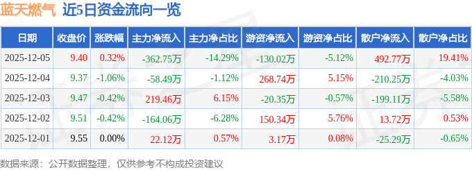 证券之星消息,截至2025年12月5日收盘,蓝天燃气(605368)报收于9.4元,上涨0.32%,换手率0.38%,成交量2.71万手,成交额2539.23万元。