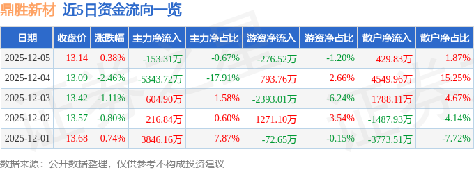 证券之星消息,截至2025年12月5日收盘,鼎胜新材(603876)报收于13.14元,上涨0.38%,换手率1.89%,成交量17.54万手,成交额2.3亿元。