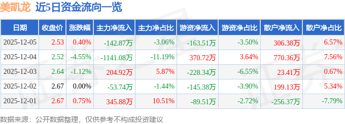 12月5日的资金流向数据方面,主力资金净流出142.87万元,占总成交额3.06%,游资资金净流出163.51万元,占总成交额3.5%,散户资金净流入306.38万元,占总成交额6.57%。