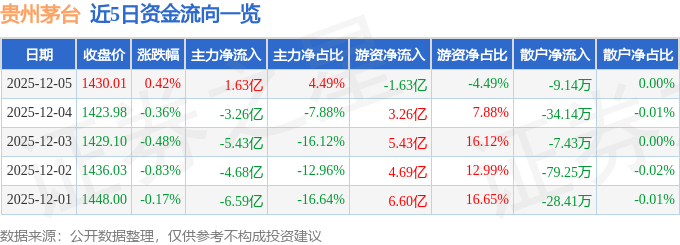 证券之星消息,截至2025年12月5日收盘,贵州茅台(600519)报收于1430.01元,上涨0.42%,换手率0.2%,成交量2.54万手,成交额36.23亿元。