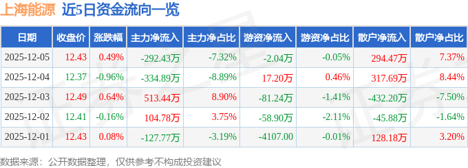 证券之星消息,截至2025年12月5日收盘,上海能源(600508)报收于12.43元,上涨0.49%,换手率0.45%,成交量3.23万手,成交额3995.31万元。