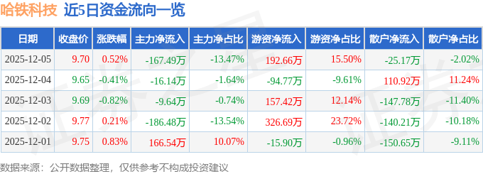 证券之星消息,截至2025年12月5日收盘,哈铁科技(688459)报收于9.7元,上涨0.52%,换手率0.73%,成交量1.29万手,成交额1243.19万元。