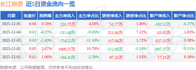 证券之星消息,截至2025年12月5日收盘,长江投资(600119)报收于8.66元,上涨0.58%,换手率0.92%,成交量3.35万手,成交额2879.86万元。