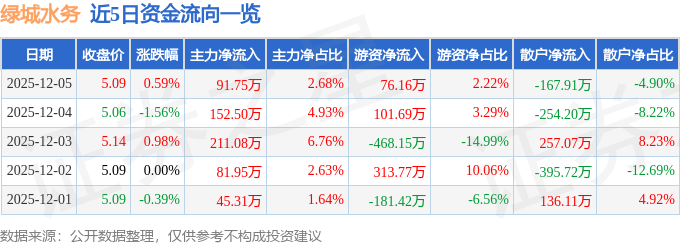 证券之星消息,截至2025年12月5日收盘,绿城水务(601368)报收于5.09元,上涨0.59%,换手率0.76%,成交量6.75万手,成交额3423.95万元。
