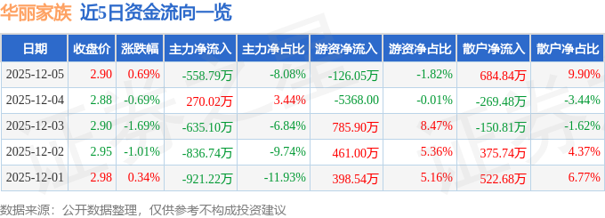 证券之星消息,截至2025年12月5日收盘,华丽家族(600503)报收于2.9元,上涨0.69%,换手率1.5%,成交量24.03万手,成交额6915.41万元。