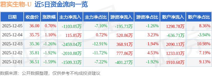 证券之星消息,截至2025年12月5日收盘,君实生物(688180)报收于36.0元,上涨0.7%,换手率0.57%,成交量4.36万手,成交额1.55亿元。