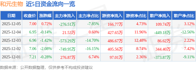 证券之星消息,截至2025年12月5日收盘,和元生物(688238)报收于7.0元,上涨0.72%,换手率0.79%,成交量5.07万手,成交额3522.95万元。