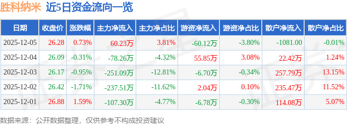 证券之星消息,截至2025年12月5日收盘,胜科纳米(688757)报收于26.28元,上涨0.73%,换手率1.74%,成交量6082.0手,成交额1581.88万元。