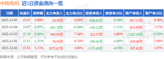 证券之星消息,截至2025年12月5日收盘,中电电机(603988)报收于25.07元,上涨0.8%,换手率1.67%,成交量3.93万手,成交额9746.38万元。