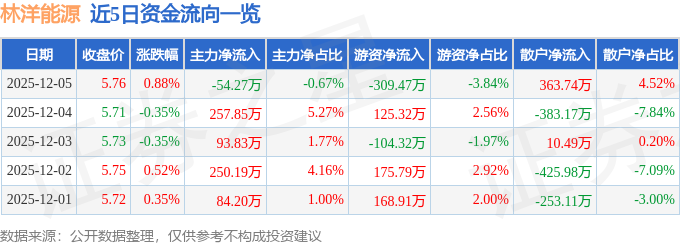 证券之星消息,截至2025年12月5日收盘,林洋能源(601222)报收于5.76元,上涨0.88%,换手率0.68%,成交量14.04万手,成交额8055.07万元。