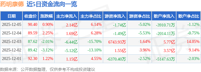 证券之星消息,截至2025年12月5日收盘,药明康德(603259)报收于90.4元,上涨0.9%,换手率1.55%,成交量38.46万手,成交额34.77亿元。