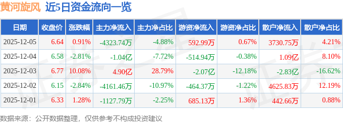 证券之星消息,截至2025年12月5日收盘,黄河旋风(600172)报收于6.64元,上涨0.91%,换手率10.52%,成交量134.22万手,成交额8.85亿元。