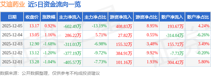 证券之星消息,截至2025年12月5日收盘,艾迪药业(688488)报收于13.17元,上涨0.92%,换手率0.84%,成交量3.53万手,成交额4567.36万元。
