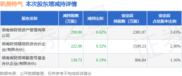 证券之星消息,12月5日凯美特气发布公告《凯美特气:关于股东及一致行动人权益变动持股比例触及1%刻度的公告》,其股东湖南省财信资产管理有限公司、湖南财信精信投资合伙企业(有限合伙)、湖南省财信常勤壹号基金合伙企业(有限合伙)于2025年12月4日至2025年12月5日间合计减持643.71万股,占公司目前总股本的0.9258%,变动期间该股股价下跌4.38%,截止12月5日收盘报20.09元。