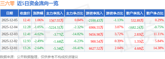证券之星消息,截至2025年12月5日收盘,三六零(601360)报收于12.41元,上涨1.06%,换手率2.16%,成交量151.52万手,成交额18.61亿元。