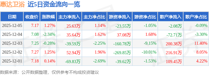证券之星消息,截至2025年12月5日收盘,惠达卫浴(603385)报收于7.17元,上涨1.27%,换手率0.82%,成交量3.14万手,成交额2240.02万元。